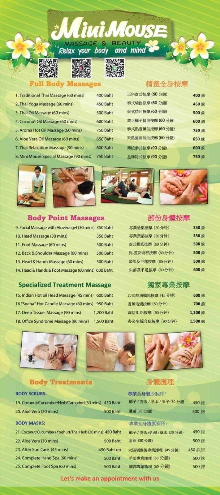 Traditional Thai Massage – A therapeutic combination of pressure points and stretching. Foot Massage - Help to reduce stress, anxiety and improve blood circulation Coconut and Aloe Vera Oil Massages – Natural ingredients to soothe and nourish your skin.